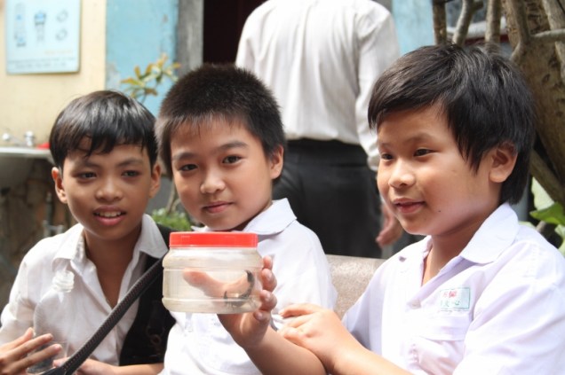 There were groups of school children roving around us, on their mid-morning break from the classrooms next door, and we noticed some of them huddled around a plastic container on the floor. On inspection we discovered that one of them, named Hoa, had brought his pet scorpion to school that day! We knew that, over here, anything with a heartbeat generally made for a plausible menu item, but this insight was a new one to add to the “only in Vietnam” list that anyone living here inevitably draws up from day one.